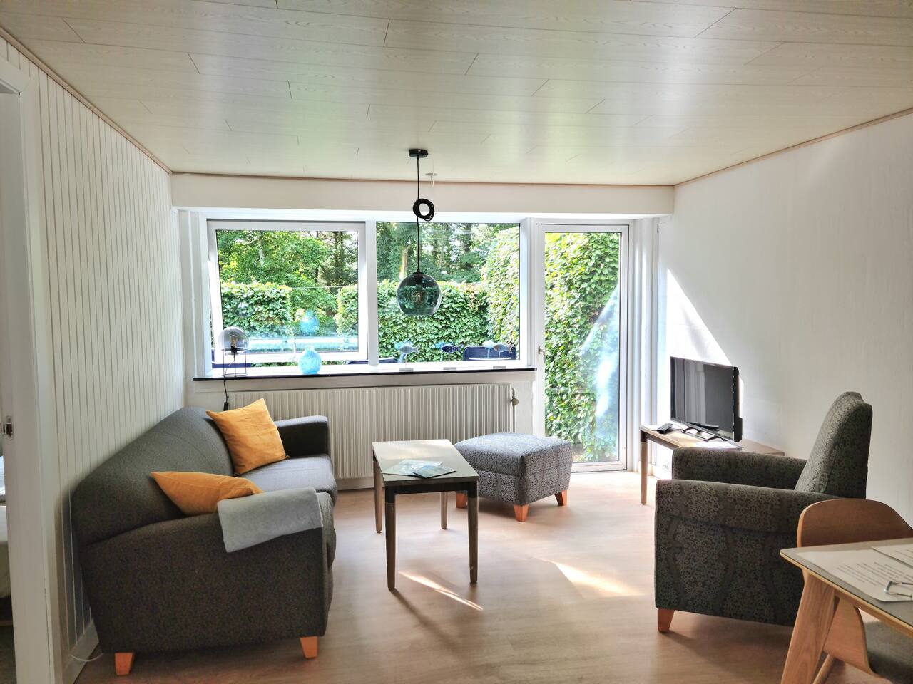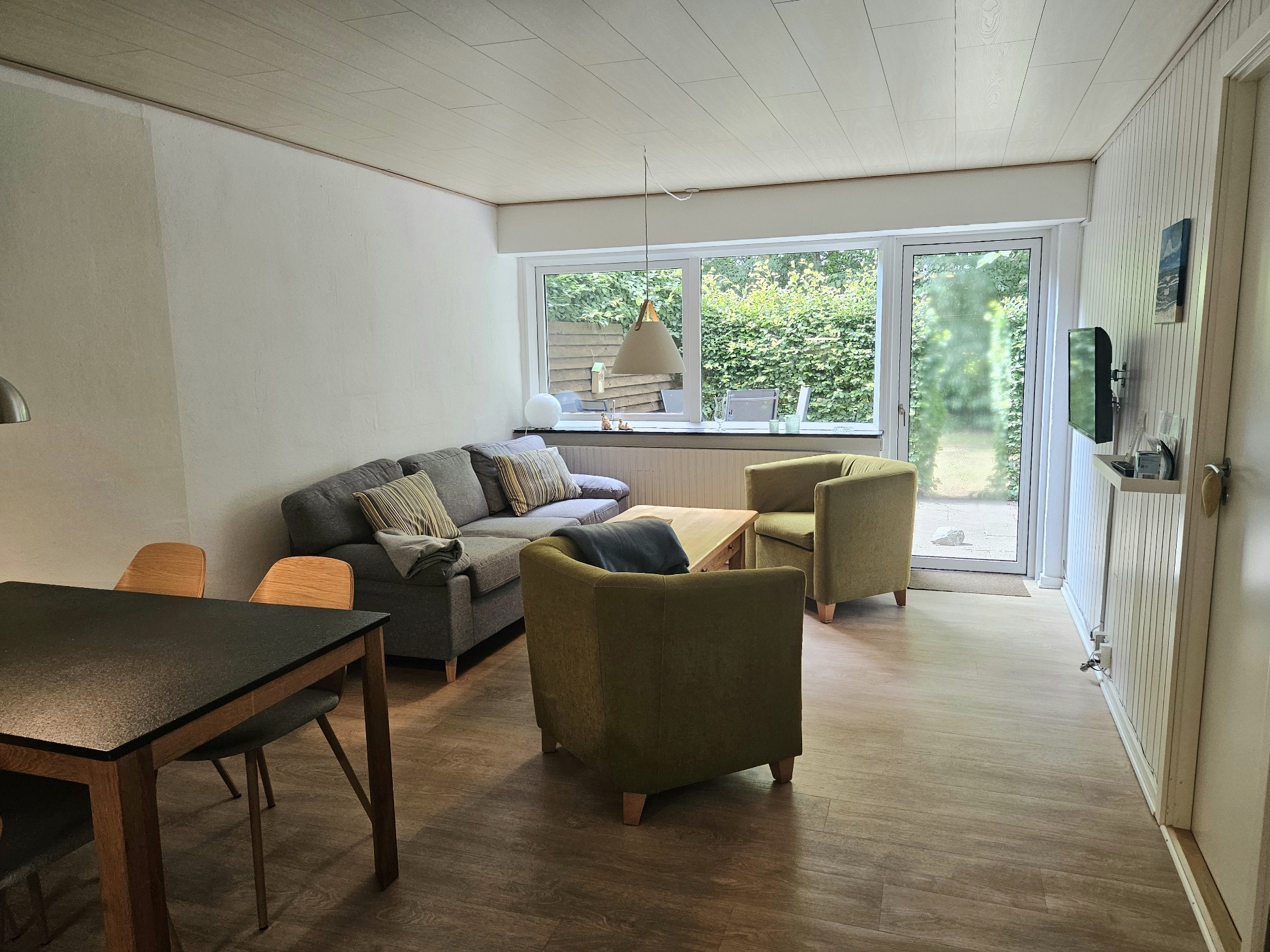 Die Wohnung bietet auf 46 m² zwei Schlafzimmer, eine gemütliche Sitzecke im Wohnbereich, einen gut ausgestatteten Küchenbereich und eine sonnige Terrasse im Grünen – perfekt für kleine Familien oder Freundesduos.